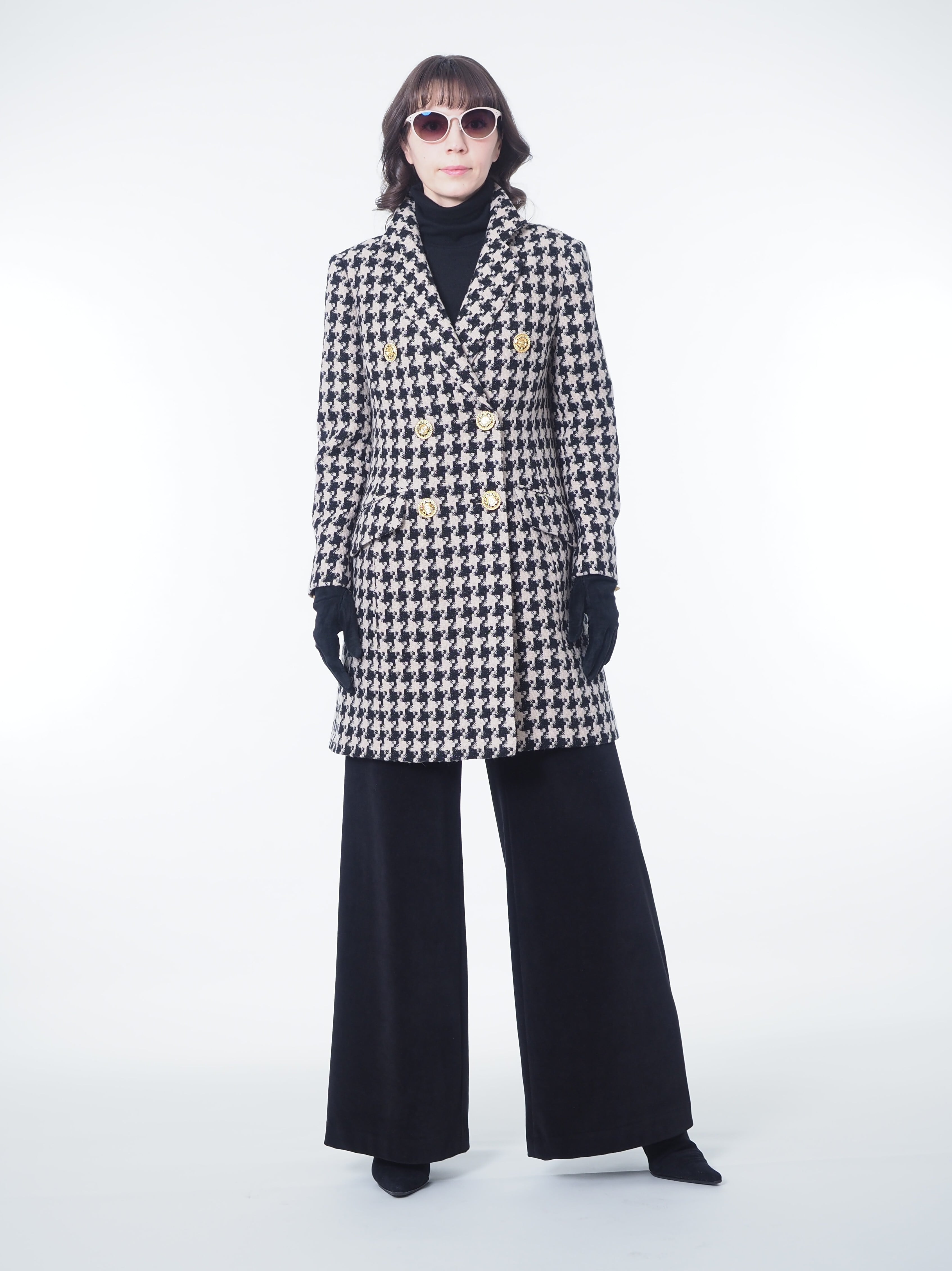 ウールとナイロン素材の千鳥チェック柄チェスターダブルコートは、スタイリッシュなデザインと温かさを兼ね備えた一着です。しなやかなウールと耐風性に優れたナイロンの組み合わせにより、寒い季節のおしゃれなコーディネートにもぴったり。トラディショナルなダブルブレストデザインが、どんなシーンでも品格を演出します。