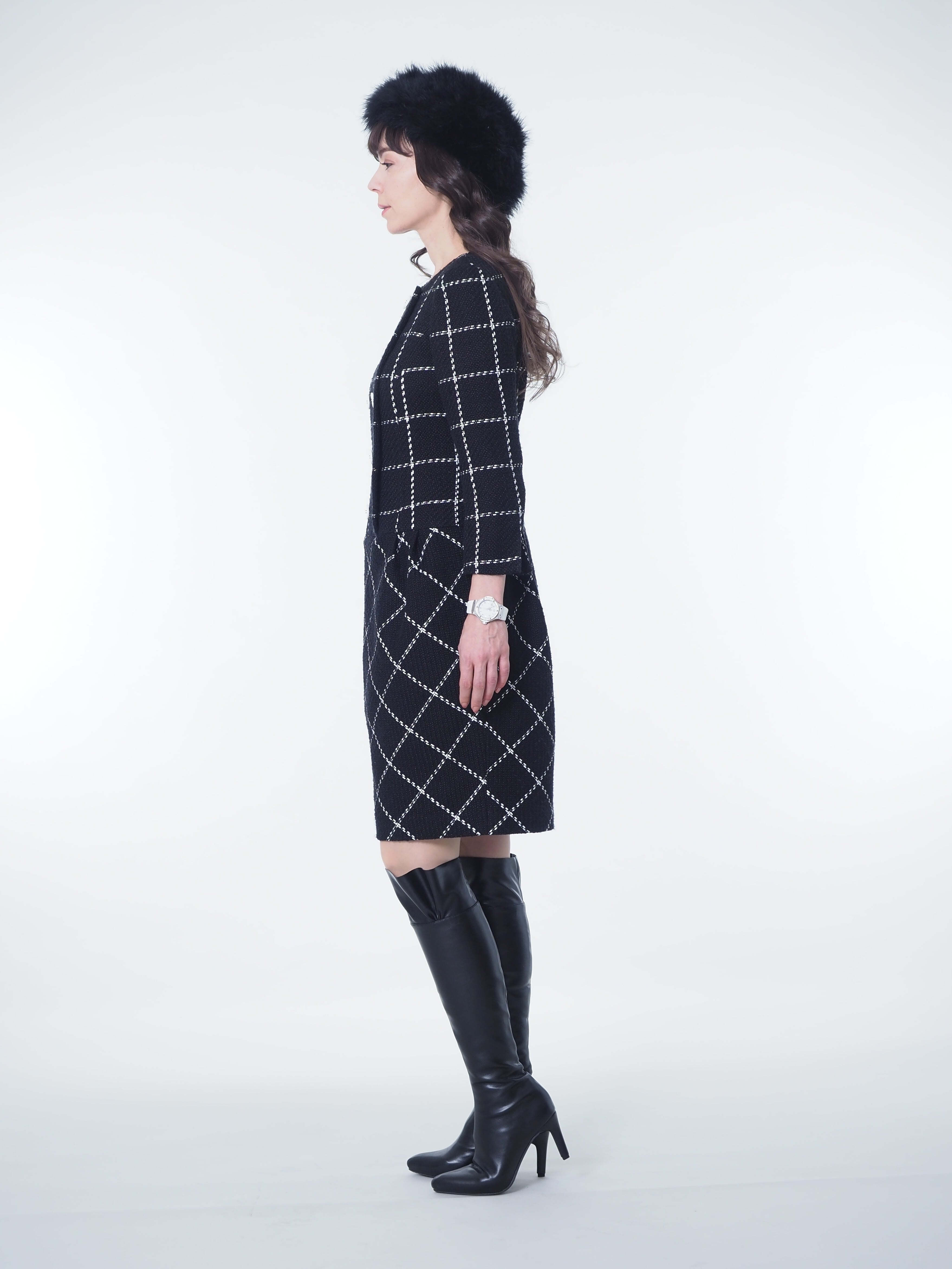 黒白のウィンドペーン柄が魅力的なダブルワンピースは、シンプルながらも上品な印象を与えてくれる一着です。
