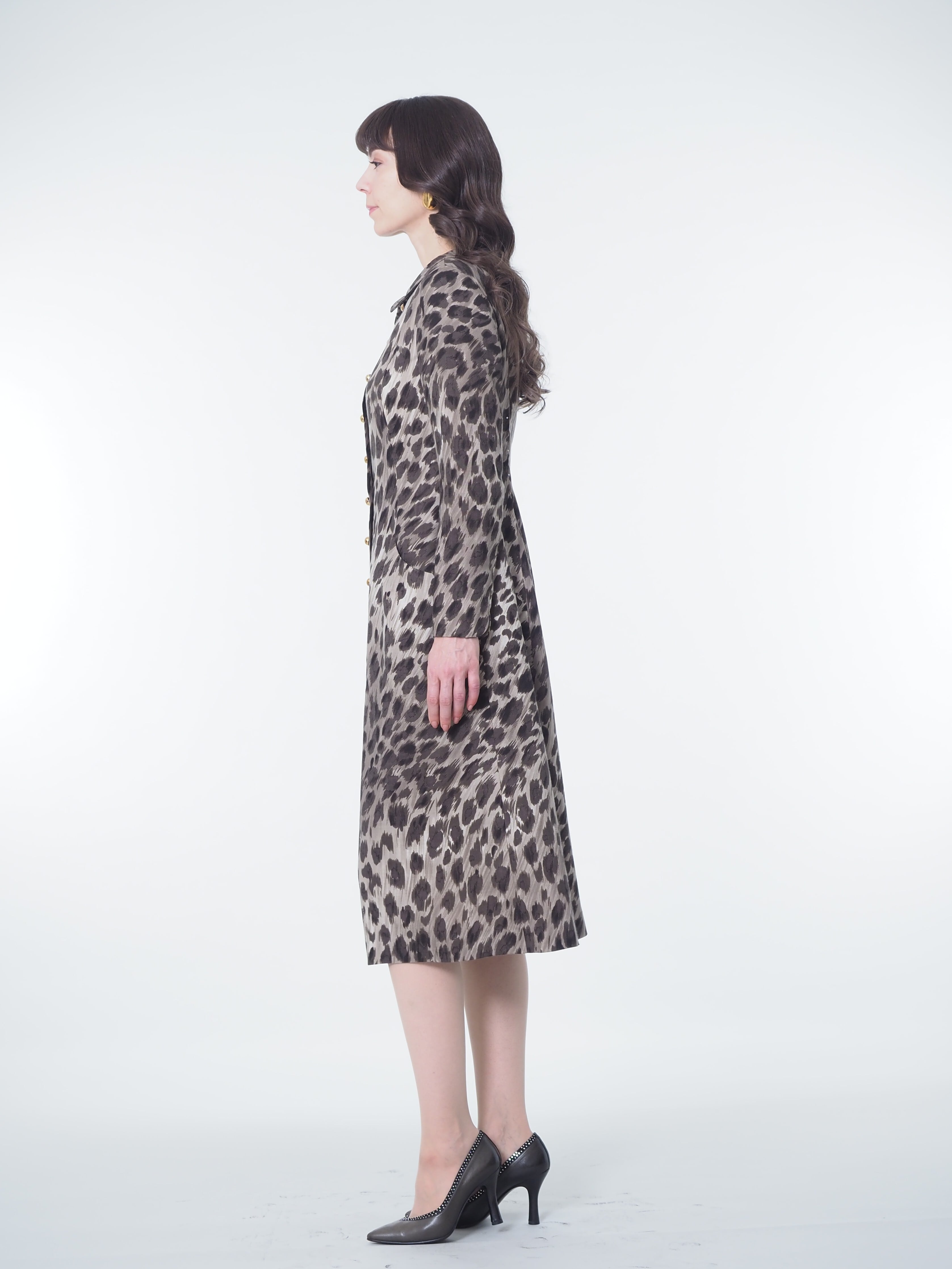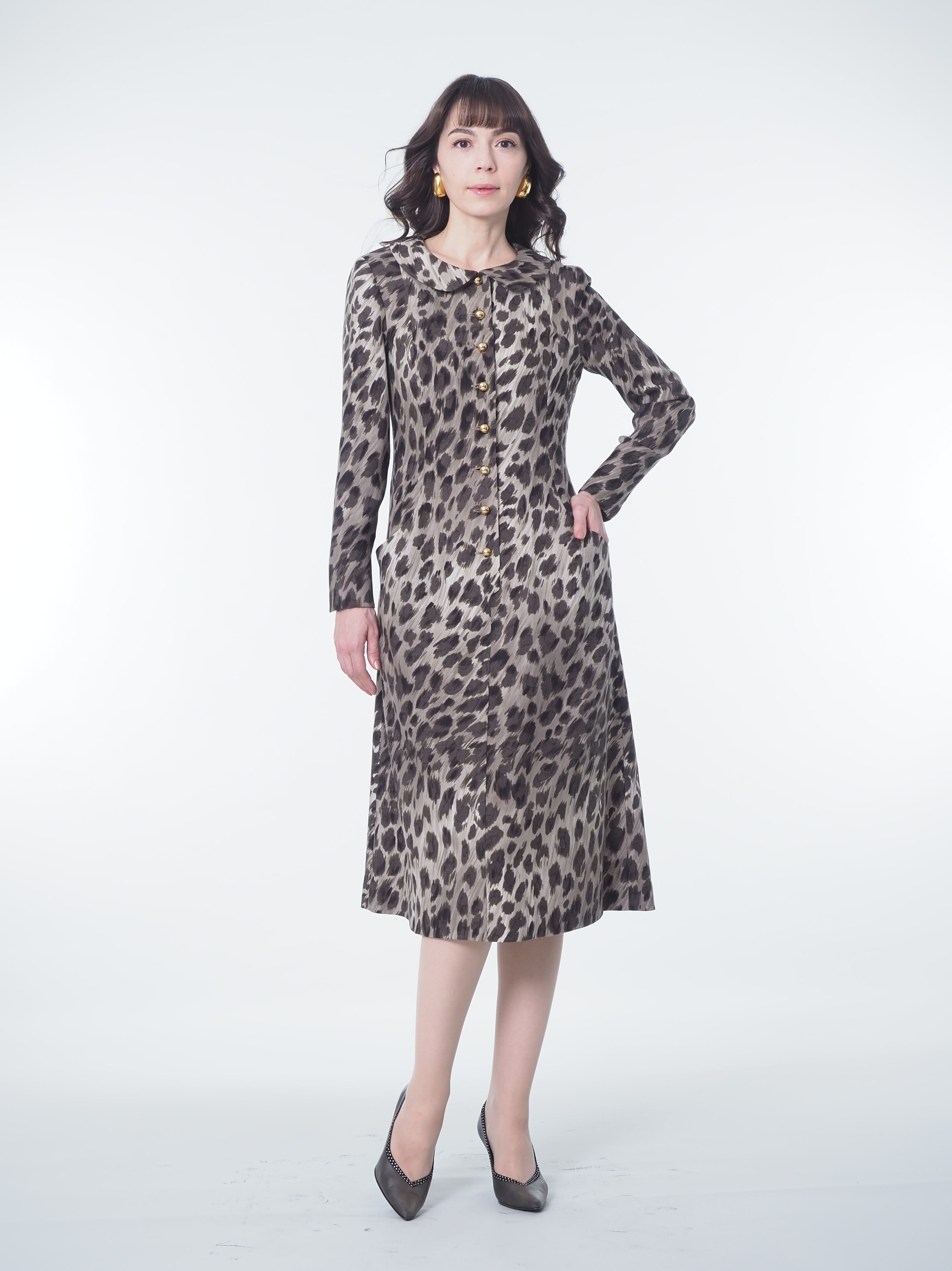 ウール素材にアニマルプリントを施したショールカラーフレアワンピースは、温かみと遊び心を兼ね備えた一着です。秋冬のお洒落なスタイルにぴったり。ショールカラーが首元をほどよく包み込み、女性らしいシルエットを演出します。